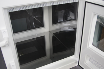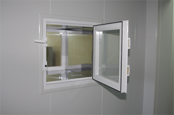 Внутренняя поверхность шлюзов изготовлена из полированной нержавеющей стали и не имеет мест, препятствующих дезинфекции. Дверная коробка и двери изготовлены из алюминия, окрашенного порошковым способом. Специальная уплотнительная резина обеспечивает герметичность примыкания двери к коробке.