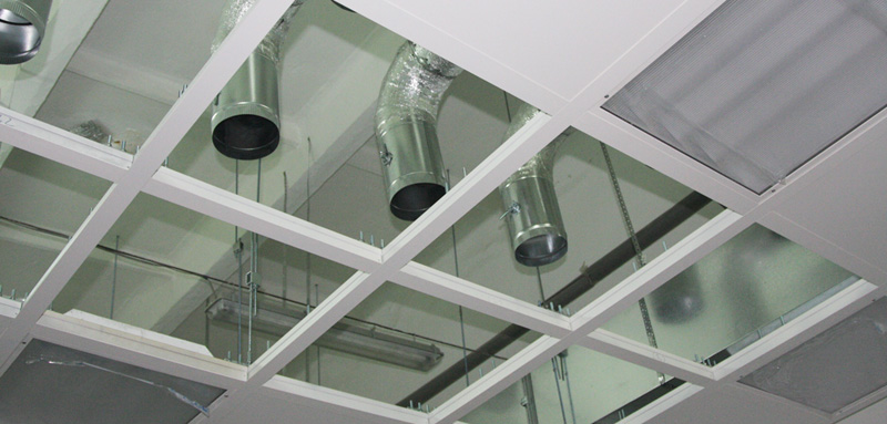 “Система панельного подвесного потолка" формируется из металлических сендвич панелей, в качестве заполнения для которых используются минераловатные плиты или полиуретан. Элементы потолка (светильники, фильтровальные и вытяжные блоки) устанавливаются путем врезания в панель.