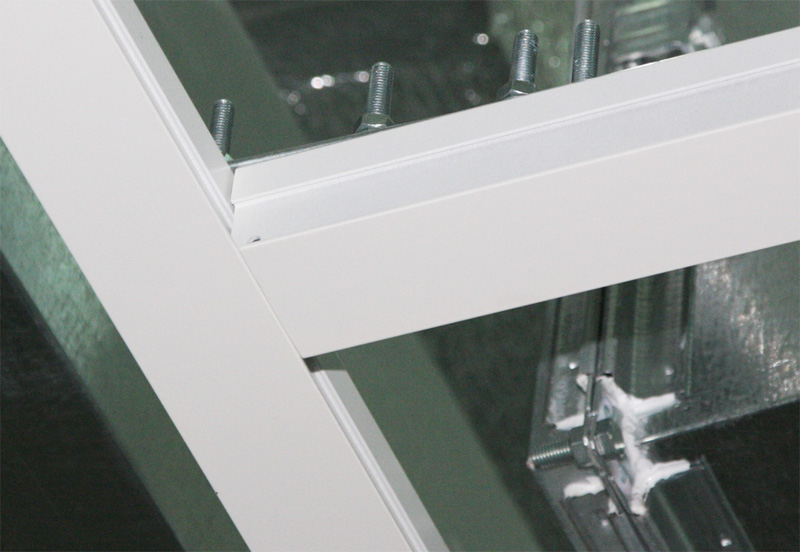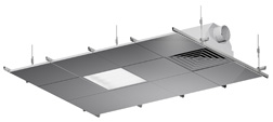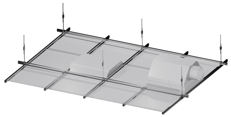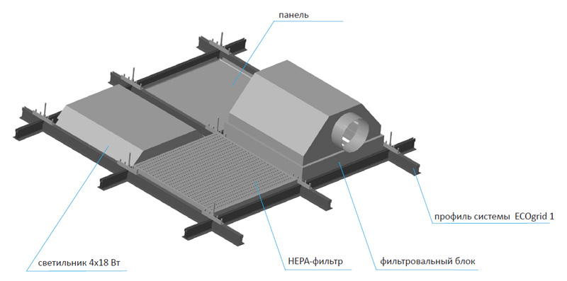 Запотолочная структура несущих профилей представляет собой жесткую неразрезную сетку. Компоненты системы (панель, фильтровальный блок, светильник) могут размещаться в любой произвольной компановке.