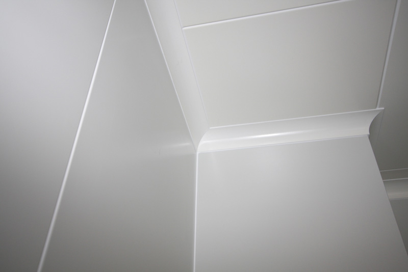 Узел примыкания потолочных панелей к стене решается посредством применения окрашеной порошковым способом аллюминиевой галтели, образующей радиусное скругление угла сопряжения.