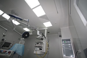 Требования к системе вентиляции: 3-х ступенчатая степень очистки воздуха. Вертикальный низпадающий низкотурбулентный (ламинарный) поток. Принимая во внимание разнообразие типов операций, площадь защищенного операционного поля может отличаться, однако должна включать в себя зону операционного стола, весь персонал оперирующей бригады, а также столики с инструментами и стерильными материалами. Рекомендованная площадь защищенного операционного поля - 3 х 3 м (достигается путем использования ламинарного пленума площадью 3,2 х 3,2 м).